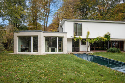 Die vier neuen Räume sind sternförmig um den Flur gruppiert und jeweils mit einem eigenen, direkten Zugang zum Garten ausgestattet. Ein gusseiserner Kaminofen im Flur schafft Behaglichkeit und setzt optisch einen ansprechenden Akzent. Bodentiefe Glasfronten sorgen für eine optimale Belichtung und verleihen Leichtigkeit und Transparenz. Alle Räume sind mit dunklen Eichenholzböden ausgestattet, die Bäder erhalten durch Böden und Wandbeläge aus Naturstein eine exklusive Note. Eine Teilunterkellerung schaffte zusätzlichen Stauraum.