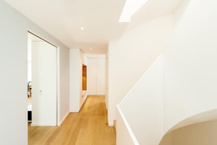 Das alte Treppenhaus wurde abgebrochen und zugunsten einer optimalen, modernen Grundrissgestaltung an anderer Stelle neu aufgebaut. Krönender Abschluss des quadratischen Treppenhauses ist ein großes Dachflächenfenster zentral über dem Treppenauge, wodurch alle Ebenen bis ins Erdgeschoss mit Tageslicht versorgt werden.