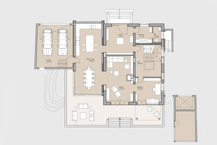 Der neue Anbau bildet mit einer vorgesetzten großflächigen Verglasung optisch einen modernen Kontrast zum historischen Bestand. Die dahinter liegende, weitläufige Küche wurde mit einem großzügigen Arbeitsbereich, einer Kochinsel und einem Essplatz für 10 Personen zum Herzstück des Hauses. Um mehr Licht und Offenheit in den historischen Teil des Hauses zu bringen, wurden die ehemaligen Außenwände aufgebrochen und mit bodentiefen Schiebeelementen versehen. Eine an zwei Seiten umlaufende, erhöhte Terrasse bietet mit einer Lounge-Ecke privaten Rückzug und lenkt den Blick in den Garten.