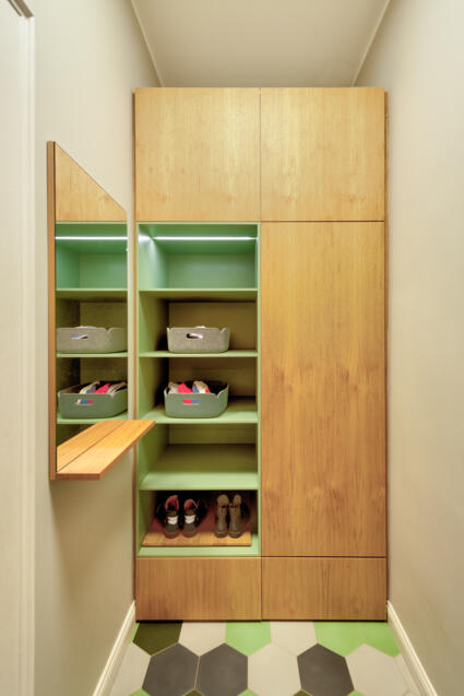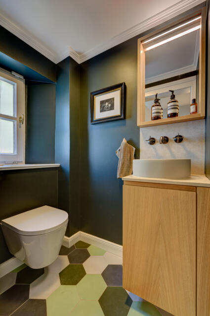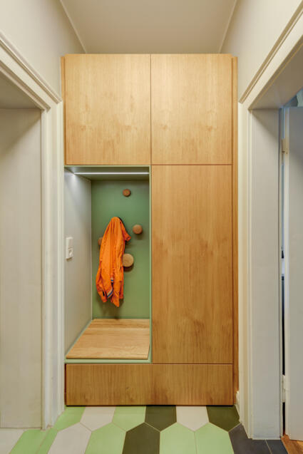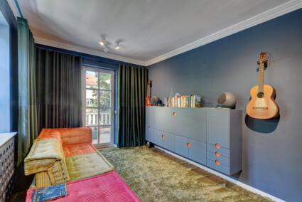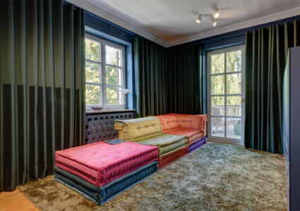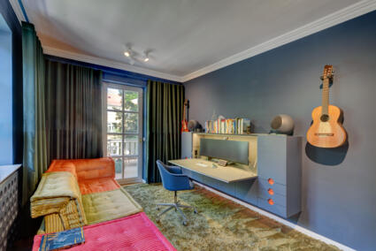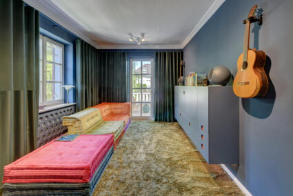 In Abstimmung mit der Denkmalschutzbehörde erhielt das Gebäude eine zurückhaltende Farbgebung, die den historischen Charme unterstreicht. Im Inneren wurde ein modernes Farbkonzept umgesetzt, das die traditionellen Elemente aufgreift und gleichzeitig moderne Akzente setzt. Die Holzarbeiten, einschließlich einer maßgefertigten Küche, wurden von einem renommierten Schreiner umgesetzt.