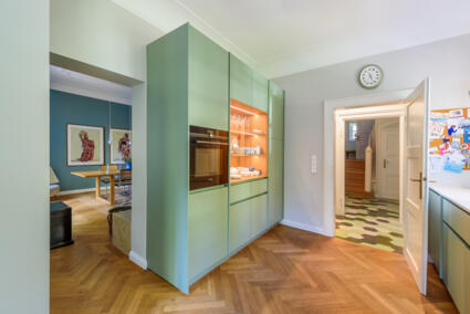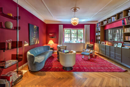 Das edle Fischgrät-Parkett und die schmalen weißen Sockelleisten harmonieren perfekt mit der historischen Holztreppe. Der neu gestaltete Kamin fügt sich dezent in den Raum ein und unterstreicht das durchdachte Raumkonzept, das sowohl moderne Ansprüche als auch historische Werte berücksichtigt.