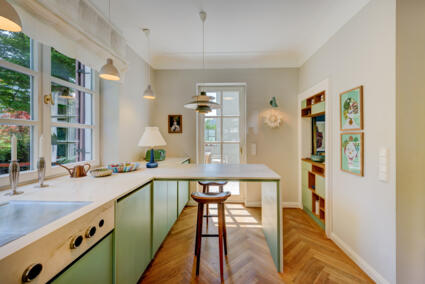 Vor der Sanierung standen jedoch grundlegende Maßnahmen an: Die Außenanlagen und die Regenentwässerung mussten zunächst komplett neu geplant werden, um das Kellergeschoss vor Überschwemmungen zu schützen. Alle historischen Elemente wie Stuck, Balkon-Balustrade, Türen und Fenster sollten erhalten bleiben und wurden sorgfältig restauriert.