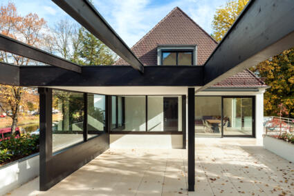 Durch die Sanierung und Umstrukturierung des Grundrisses entstanden in Verbindung mit dem offenen Wohn- und Essbereich völlig neue Perspektiven. Großformatige Hebeschiebetüren führen auf die weitläufige Terrasse mit Blick auf den Kanal und sorgen bei sommerlichen Temperaturen für ein mediterranes Wohngefühl. Das Farb- und Materialkonzept orientiert sich außen am Bestand, im Innenbereich unterstützen Eichenparkett, helle Wände und die matt-weißen Lackoberflächen der Einbaumöbel den lichtdurchfluteten Charakter.