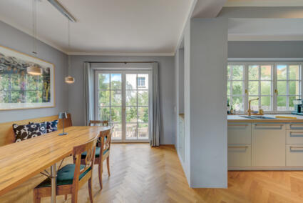 Bei der umfangreichen Kernsanierung des Erdgeschosses sowie des Dachspitzes wurden alte Bestandseinbauten behutsam aufgearbeitet und neue Fenster und Türen nach historischem Vorbild hergestellt, um die Authentizität des Hauses zu erhalten.