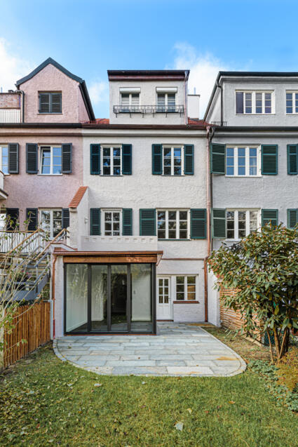 Beim Umbau und der Sanierung mit modernen Wohnansprüchen verlangten deshalb die strengen, denkmalschutzrechtlichen Auflagen nicht nur bei Bodenbelag und historischer Raumaufteilung einen gestalterischen Spagat. So musste sich der neu geschaffene Wintergarten-Anbau mit moderner Stahlfassade unter den bestehenden historischen Balkon einfügen.