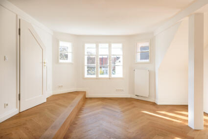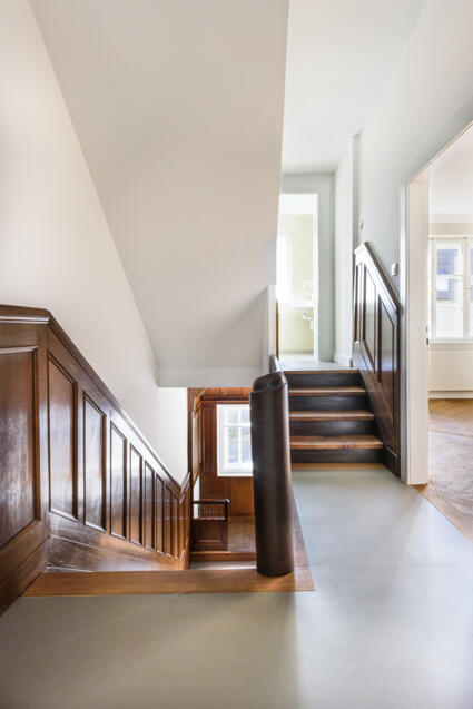 Die bestehenden Oberflächen von Holzverkleidungen, Fenstern, Türen sowie Bodenbelägen wurden soweit möglich sorgfältig aufgearbeitet oder entsprechend dem historischen Vorbild nachgebaut. Im Rahmen der Sanierung wurden alle Sanitär- und Elektroinstallationen erneuert, um neuesten technischen Standard zu gewährleisten. Durch das Tieferlegen der Bodenplatte im Gartengeschoss konnte mehr Raumhöhe gewonnen werden. So wichen niedrige Nebenräume einem großzügigen, repräsentativen Wohnraum, der ebenerdig an den Garten anschließt